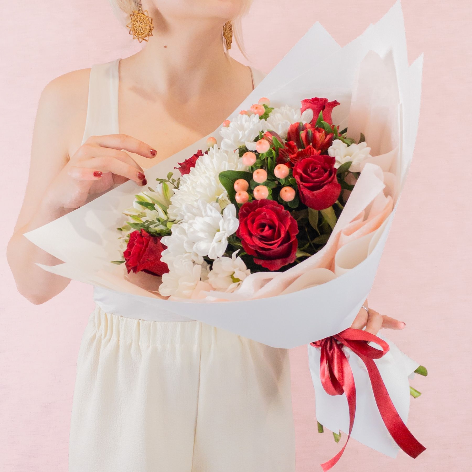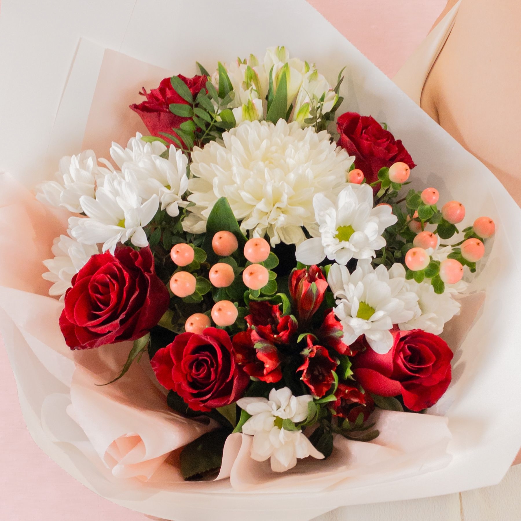 Этот изысканный букет — символ любви, чистоты и гармонии! Красные розы дарят страсть, белые хризантемы — нежность и элегантность, гиперикум добавляет энергии, а альстрёмерии символизируют дружбу и поддержку. Прекрасное решение для любого случая: от признания в чувствах до выражения благодарности. Яркий дизайн и насыщенные цвета подарят радость получателю и подчеркнут вашу заботу!